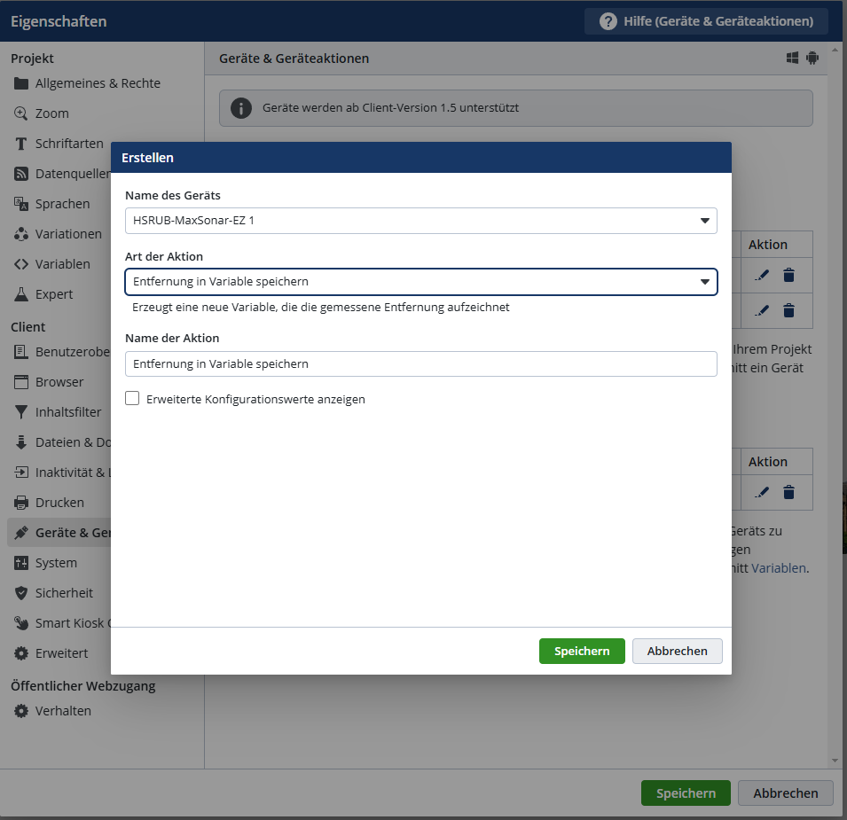 Als nächstes muss die Geräteaktion festgelegt werden, um eine bestimmte Aktion im Projekt auszulösen. Der Abstandssensor kann zwei verschiedene Aktionen auslösen: