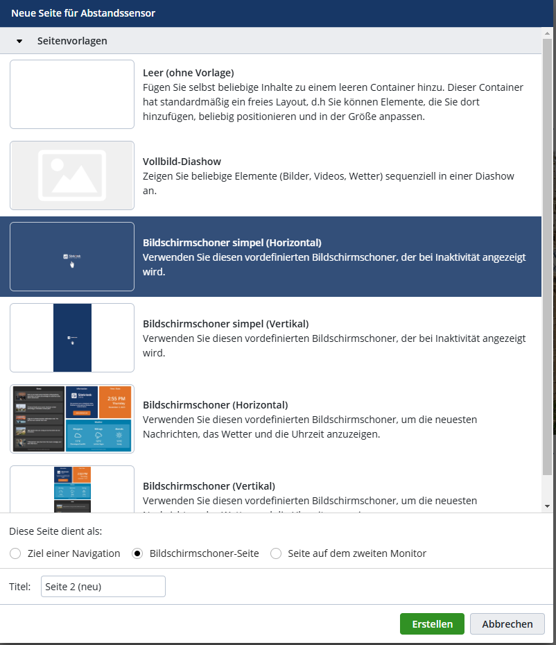 2. In diesem Beispiel wurde die Vorlage „Bildschirmschoner simpel (Horizontal)“ ausgewählt. Achten Sie darauf, dass in der Auswahlzeile „Diese Seite dient als:“ die Option „Bildschirmschoner-Seite“ ausgewählt ist. Elemente können ebenfalls als Bildschirmschoner verwendet werden, hierfür muss am gewünschten Element die Anzeigebedingung manuell angepasst werden (Bildschirmschoner (Benutzer inaktiv) für alle Seiten und Elemente)