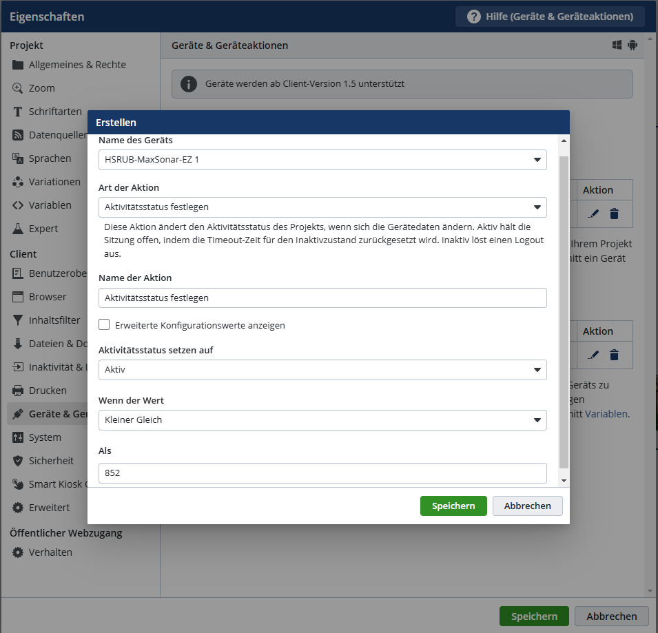 In Projekten, in denen die Abstandsmessung als Auslöser für eine Aktion (Das Anzeigen eines Elementes) verwendet werden soll, müssen die folgenden Einstellungen getroffen werden: