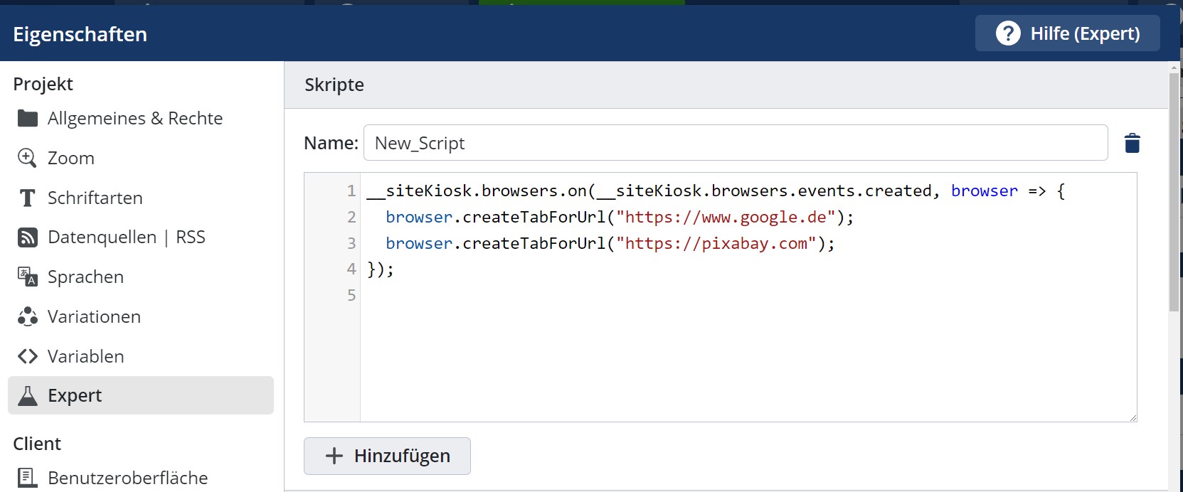 Info: Weitere Tabs können hinzugefügt werden, indem das Skript mit der folgenden Zeile ergänzt wird: