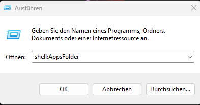 Geben Sie anschließend im Feld „Öffnen“ den Befehl shell:AppsFolder ein und klicken Sie auf „OK“.