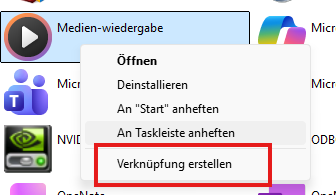 Suchen Sie nun die gewünschte App, klicken Sie sie mit der rechten Maustaste an und wählen Sie „Verknüpfung erstellen“ aus.