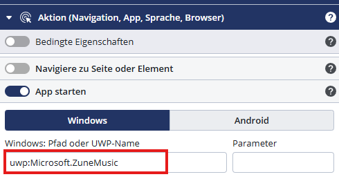Aktivieren Sie dort „Start app/program“ und tragen Sie den Paketnamen im folgenden Format ein: uwp:Microsoft.ZuneMusic