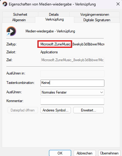 In diesem Beispiel soll die App Groove Music verwendet werden. Dafür benötigen wir folgenden Teil aus dem Feld „Zieltyp“: „Microsoft.ZuneMusic“