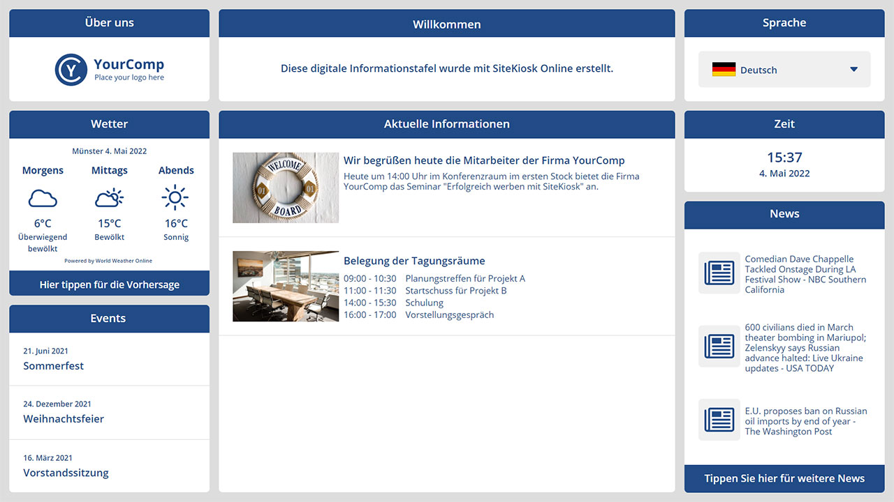 Interaktives Informationsterminal für Kunden, Gäste, Mieter oder Mitarbeiter im Eingangsbereich, in der Kantine oder am Arbeitsplatz.