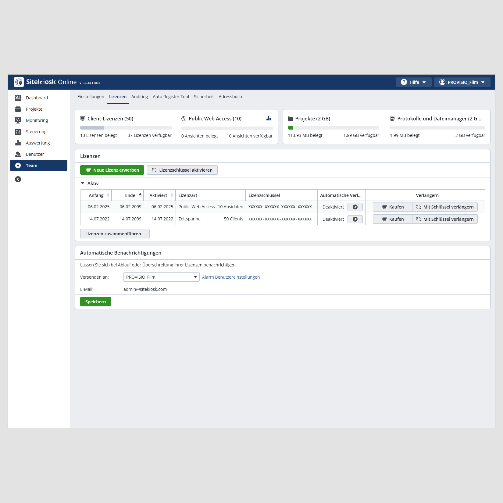 Ein Projekt gilt als verlassen, wenn der Browser minimiert oder geschlossen wird oder eine Inaktivität von 120 Minuten festgestellt wird. Bei Bedarf kann die Lizenz erweitert werden.