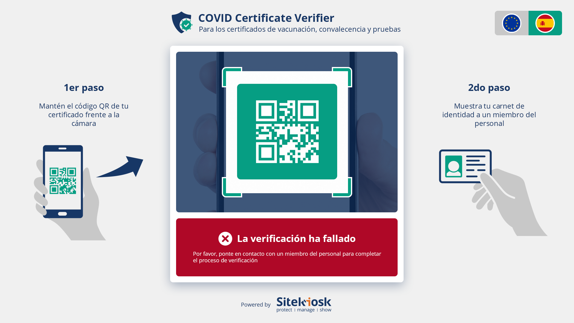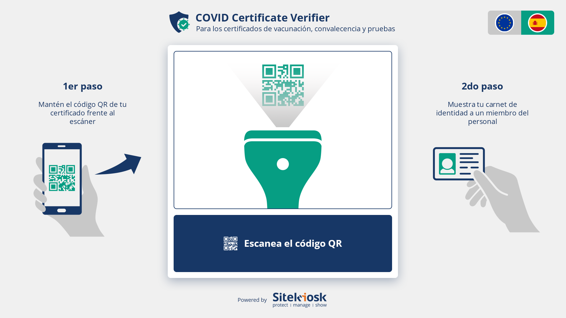 Para comprobar el certificado, necesitará en la entrada una tableta Android o un PC Windows con una cámara o un escáner de códigos QR para leer el código QR especificado en el certificado, así como pantallas que muestren la información de estado para sus visitantes.