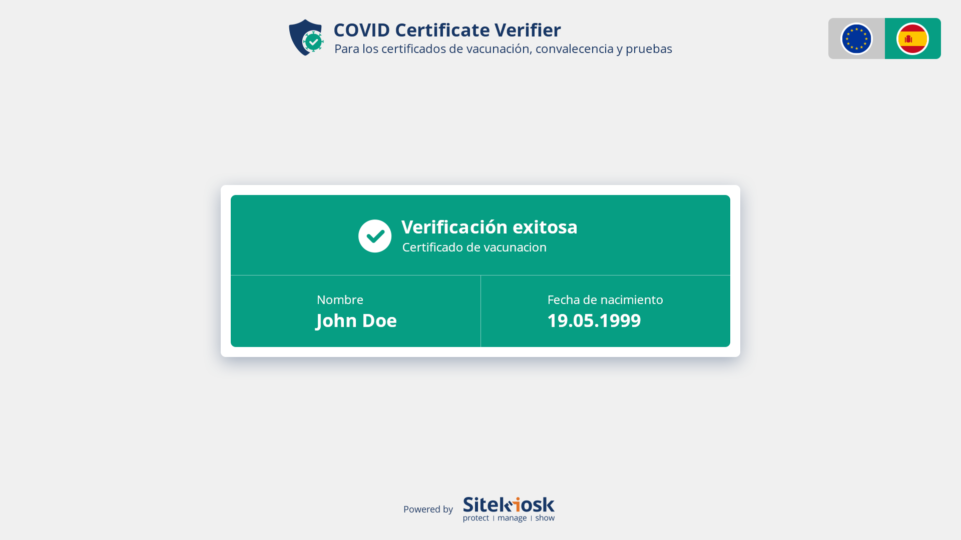 Como operador, usted decide de qué forma se mostrará el resultado de la verificación: si es visible para los visitantes en forma de semáforo en una pantalla pública o sólo para los empleados que pueden ver los datos personales al mismo tiempo. Opcionalmente, los datos del certificado pueden guardarse con la marca de tiempo del escaneo.