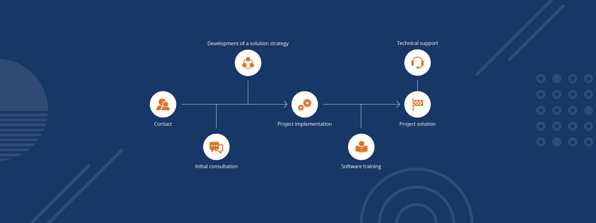 Sur la base de vos spécifications, nous créons un concept pour la mise en œuvre technique qui inclut les fonctions à utiliser. Nous sommes bien-entendu très attentifs au budget et au délai que vous avez spécifiés. En outre, une coopération transparente basée sur la communication est extrêmement importante pour nous - pour votre satisfaction et pour maintenir la qualité de notre service.
