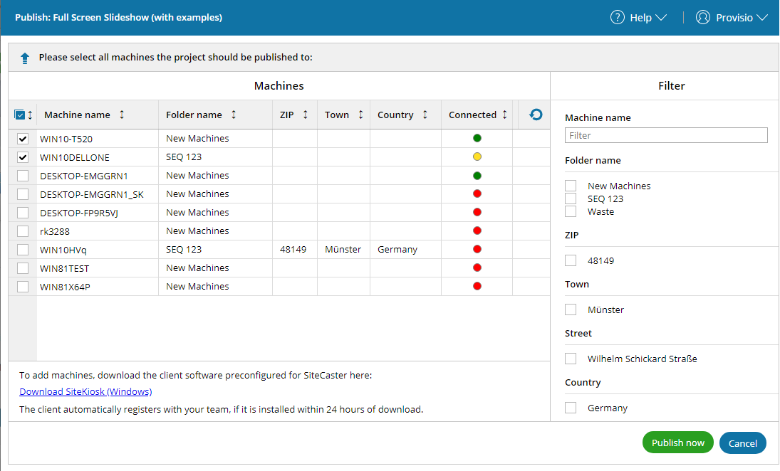 Publish page by creating filter rules. This can come in quite handy when you are working in a team with a lot of machines, but want to publish your project only to a few of them. You can use the Machine name input field to directly search for names containing certain strings or you can use the check boxes to filter machines by other attributes provided by SiteRemote: