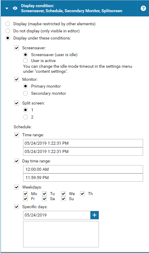 Bei Aktivierung der Funktion Unter folgenden Bedingungen anzeigen können Sie im Bereich Zeitplan mit Hilfe der Eingabefelder und Checkboxen die gewünschten Anzeigezeiträume (Datum und Uhrzeit) sekundengenau definieren. Verwenden Sie diese Einschränkungen, wenn Sie z.B. ein Element ab einem gewissen Datum gegen ein anderes austauschen möchten. Legen Sie dazu zwei Elemente im gleichen Container (z.B. Austauschcontainer) an und stellen Sie deren Zeiträume entsprechend auf den Zeitraum vor dem bestimmten Datum (erstes Element) bzw. auf den Zeitraum danach (zweites Element) ein. So können Sie beispielsweise allen Kunden ab dem 01. Januar statt einer besinnlichen Weihnachtszeit ein frohes neues Jahr wünschen, ohne zu diesem Zeitpunkt das Projekt aktualisieren und veröffentlichen zu müssen. Zu jedem Zeitpunkt wird auf den Clients dann nur das zu diesem Zeitpunkt passende Element angezeigt. Ebenso ermöglichen die Optionen unter Zeitlich auch die zeitliche Anzeigekontrolle von immer wiederkehrenden Mustern wie z.B. immer Montags und Donnerstag von 15:00 - 20:00 Uhr. Sie können diese Funktionen verwenden, wenn Sie z.B. möchten, dass ein Element nur morgens und ein anderes Element stattdessen nur Abends angezeigt werden soll. Legen Sie dazu zwei Elemente im gleichen Container an und beschränken ihre Tageszeiten entsprechend auf morgens (z.B. 00:00 - 12:00 Uhr) und nachmittags (z.B. 12:00 bis 23:59 Uhr). Des Weiteren können Sie mit der Funktion Bestimmte Tage die Anzeige Bedingungen so konfigurieren das Elemente nur an ganz bestimmten Tagen angezeigt werden.