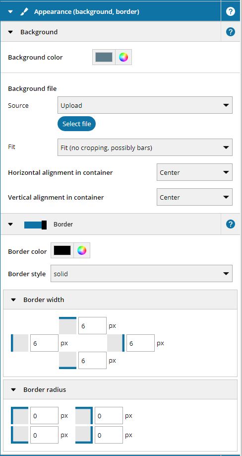 Hintergrund haben Sie die Möglichkeit eine Farbe für den Elementhintergrund einzustellen und ein Bild in den Hintergrund einzufügen. Neben der Möglichkeit die Bildanpassung für die Bilddarstellung einzustellen, können Sie auch die Ausrichtung des Hintergrundbildes im Bildcontainer einstellen.