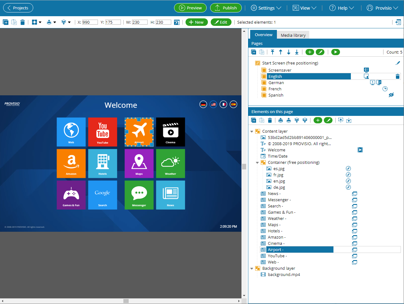 Nach dem Erstellen eines Projekts können Sie anfangen das Projekt auf der Projektseite nach Ihren Wünschen anzupassen. Der SiteCaster Editor folgt überwiegend dem WYSIWYG-Prinzip (What you see is what you get), um das Arbeiten möglichst einfach und selbsterklärend zu gestalten. Um eine einfache Bearbeitung Ihrer Projekte zu gewährleisten, sollte die Mindestbreite des Browserfensters von 1280 Pixeln nicht unterschritten werden. Weiterhin ist es sinnvoll die Ansicht des Editors so einzustellen, dass sie der Auflösung auf den Clients entspricht. Nähere Informationen für die Ansichteinstellungen finden Sie im Kapitel Auflösungseinstellungen.