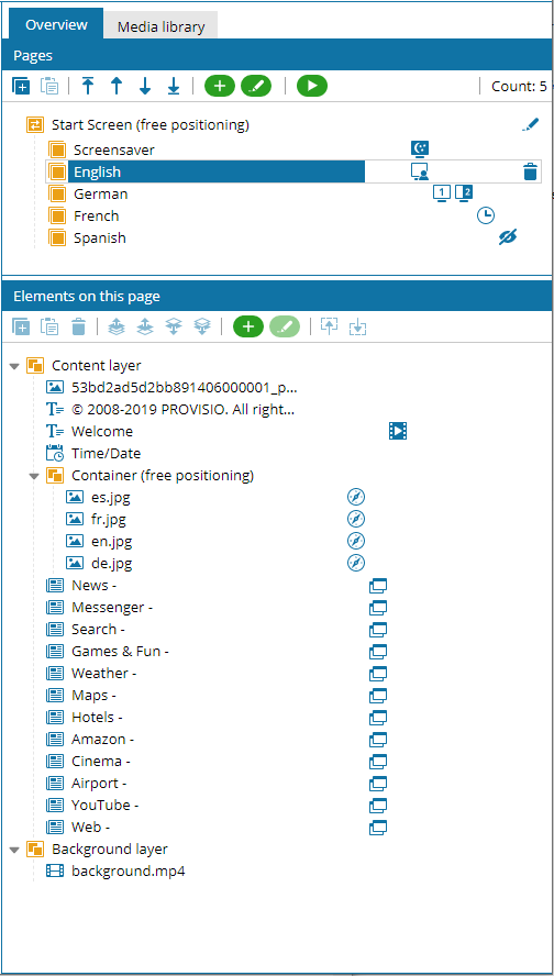 Mit Hilfe der Übersicht des Inspektor erhalten Sie einen Überblick über die im vorliegenden Projekt enthaltenen Seiten und Elemente. Innerhalb der Übersicht können Sie Elemente mit Hilfe der Maus selektieren und anschließend editieren, kopieren, verschieben oder auch neue Elemente in das Projekt einfügen. Zusätzlich wird über Icons in der Übersicht angezeigt, ob an den jeweiligen Elementen Pop-ups, Anzeigebedingungen oder Navigationslinks eingestellt sind. Mehr Informationen zur Übersicht finden Sie hier.