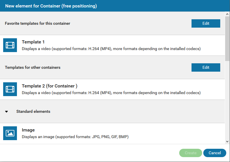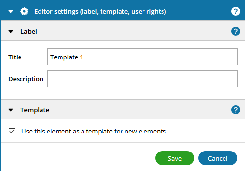 Wenn Sie angepasste Elemente wieder verwenden wollen, können Sie eine Elementvorlage erstellen. Alle Unterelemente und Eigenschaften des Elements aus dem Sie die Vorlage erstellen, lassen sich auf neu erzeugte Elemente übertragen. Zusätzlich können Elementvorlagen so verwendet werden, dass nur diese eingeschränkten Benutzern für das Einfügen in bestimmten Containern zu Verfügung stehen. Diese werden dann beim Hinzufügen unter Vorlagen für diesen Container im Dialog Neues Element für Container angeboten. Die Elemente können dabei so konfiguriert werden, dass z. B. nur der Inhalt aber nicht das Layout angepasst werden kann.
