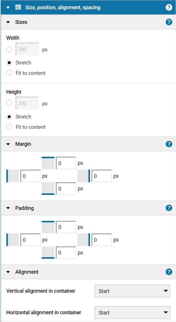 In der Option Größe können Sie die Breite und Höhe eines Elements über feste Pixelwerte oder über die Einstellung So viel Platz wie möglich einnehmen definieren.