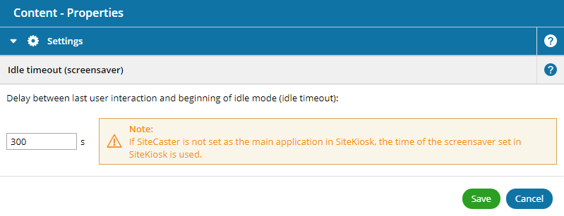 Die Funktion Inaktivitätsmodus wird nur angewendet wenn SiteCaster als alleinige Applikation im Primärmonitor verwendet wird. In allen anderen Konfigurationsmöglichkeiten (SiteCaster im 2.Bildschirm, in einer Bildschirmaufteilung oder als separater Bildschirmschoner) wird die Wartezeit vor Aktivierung des Bildschirmschoners in der SiteKiosk-Konfiguration unter Bildschirmschoner konfiguriert.