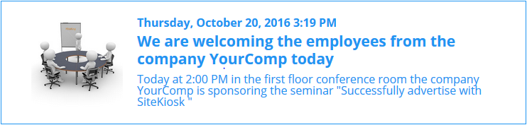 Das Element Nachrichteneintrag eignet sich gut für die Erstellungen von Kurzmeldungen wie z.B Nachrichten, Veranstaltungshinweise und Termine, welche dann z.B. in einem Überlaufcontainer mit einer Rotation oder seitenweise präsentiert werden können. Das Element kann aber auch in allen anderen Containern zum Einsatz kommen, wenn es darum geht, Text und Bild kompakt in einem Element zu kombinieren.