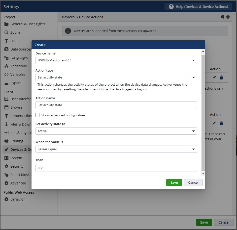 Next, the device action must be defined to trigger a specific action in the project. The distance sensor can trigger two different actions:
